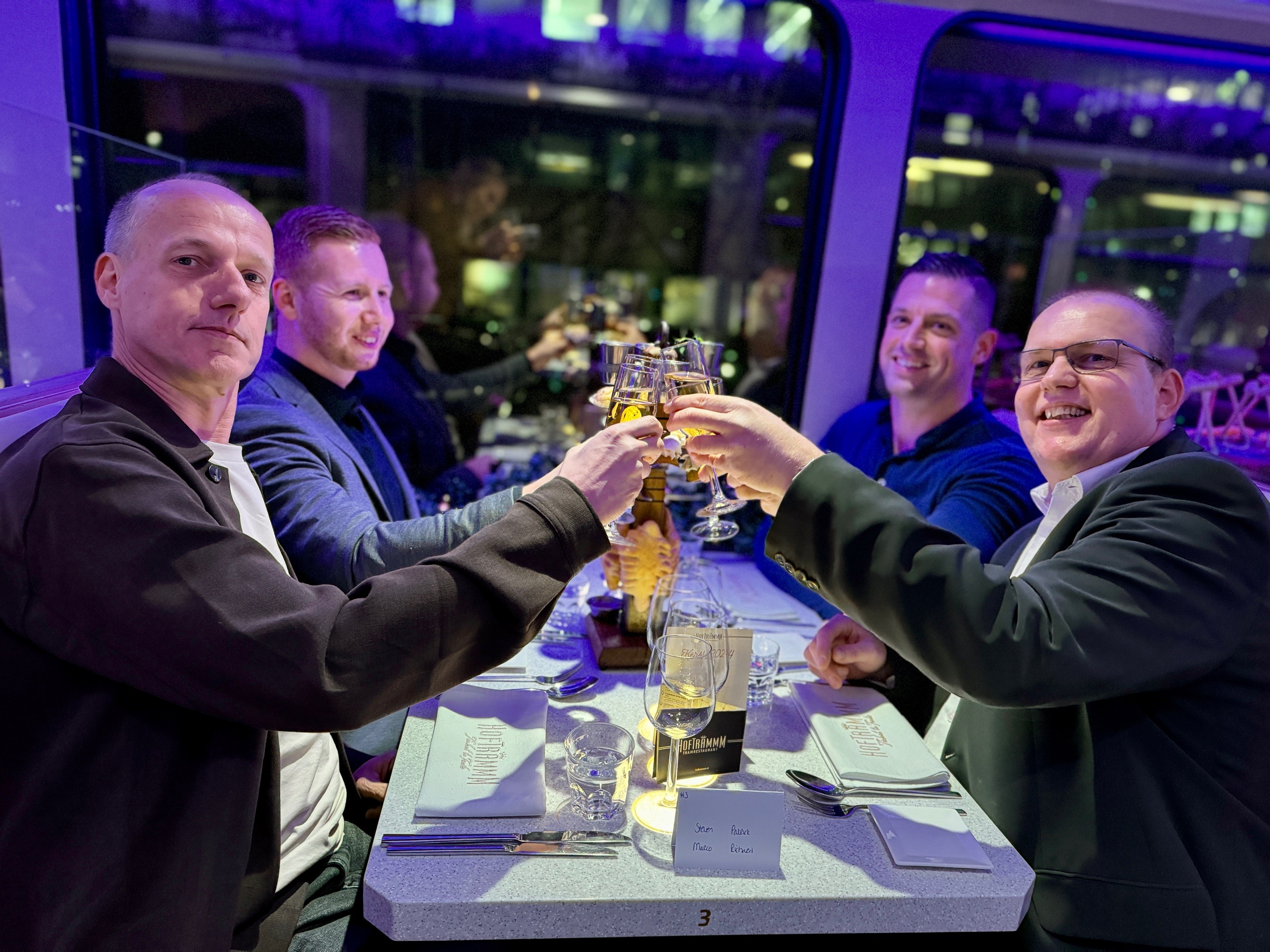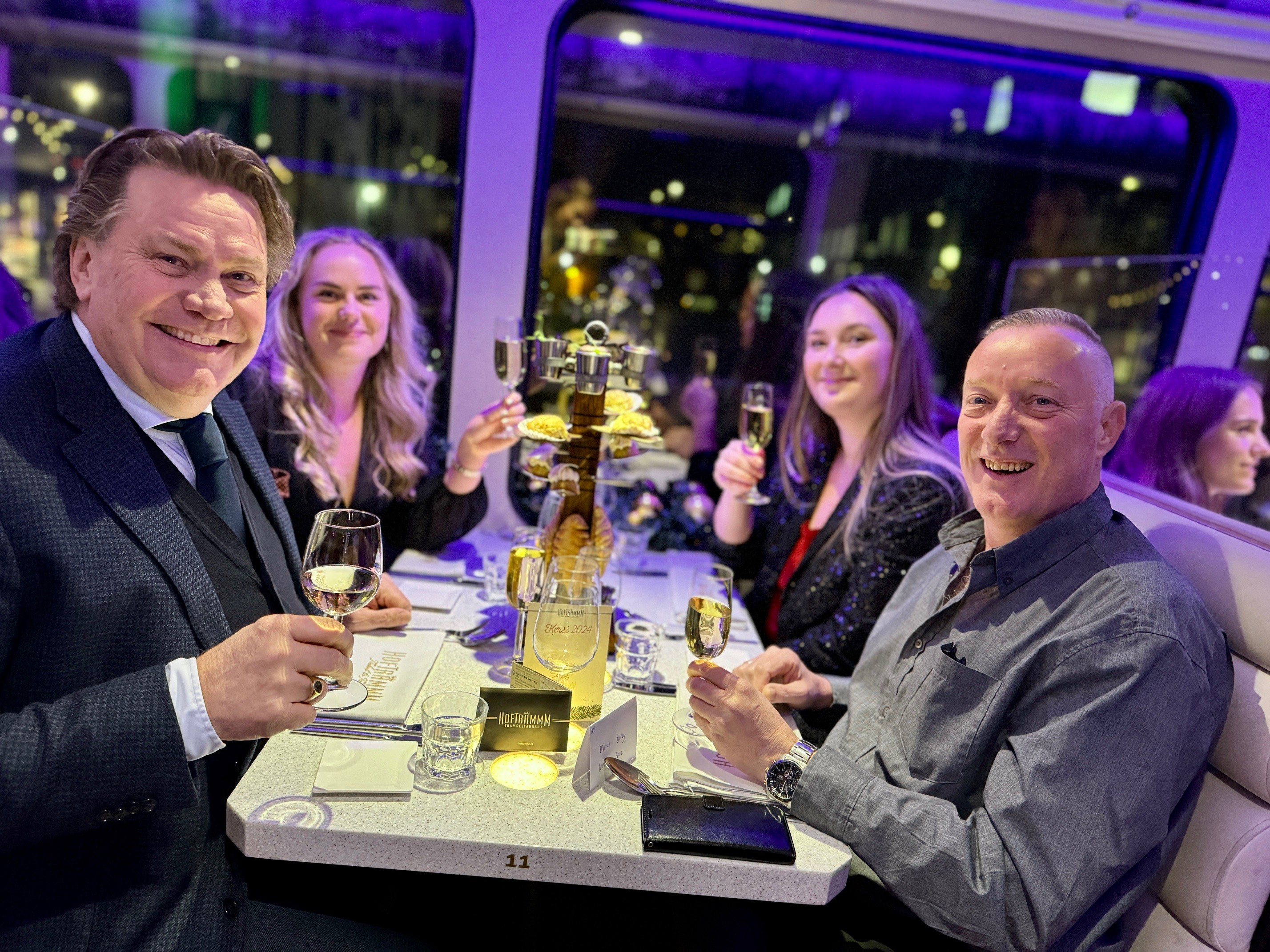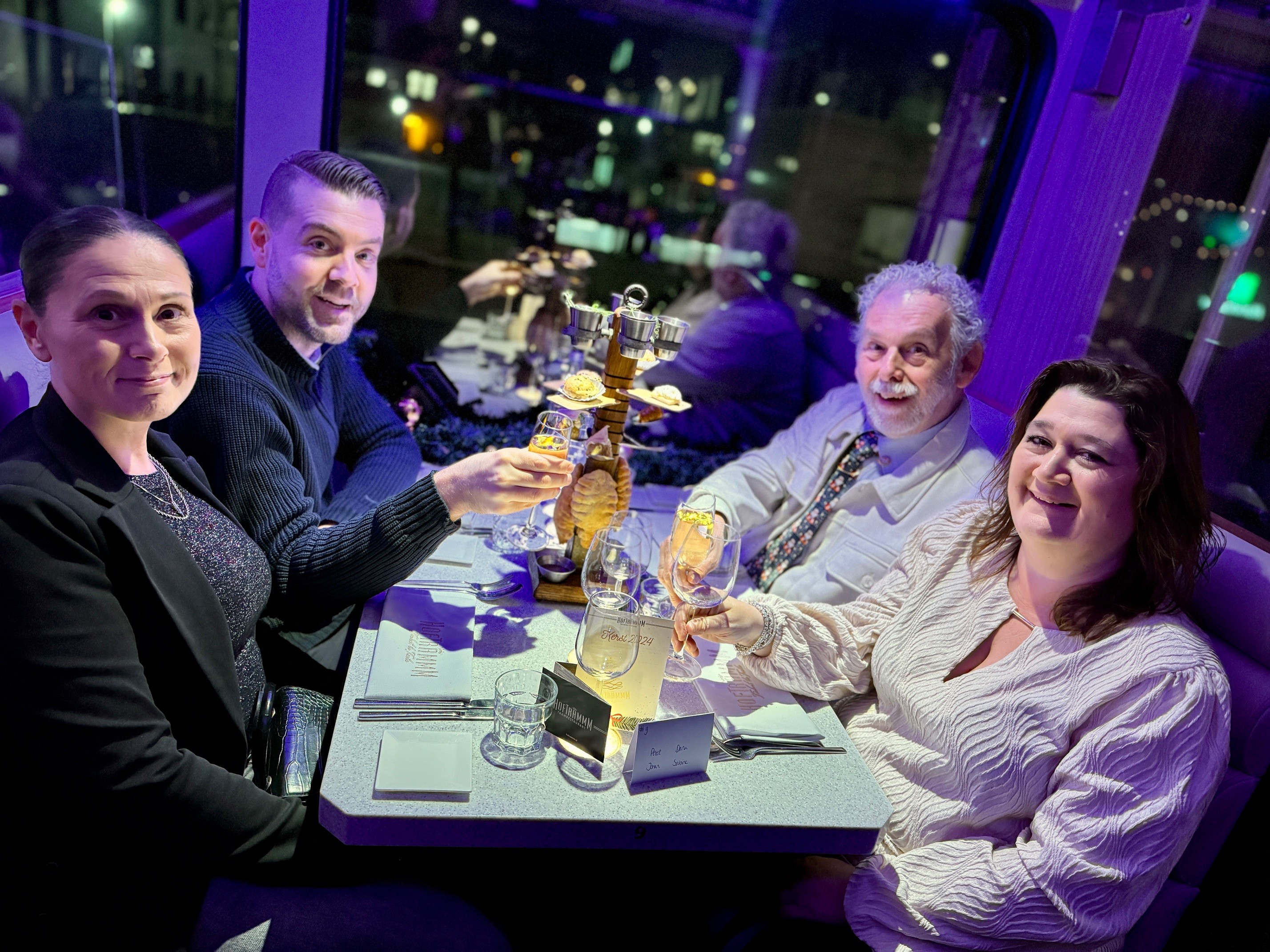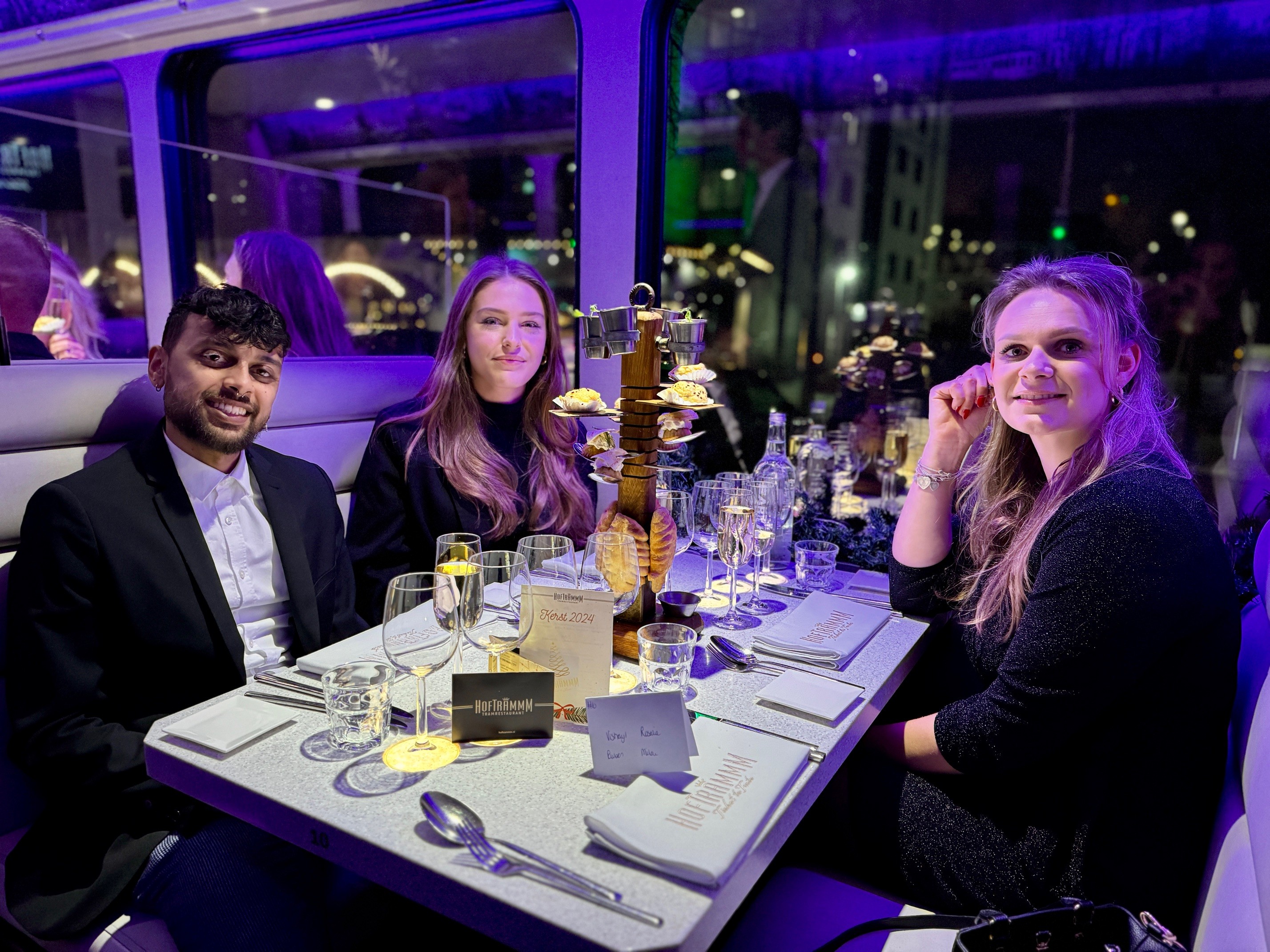 Op een koude maar sfeervolle decemberavond vierde MainPlus haar jaarlijkse kerstfeest op een wel heel bijzondere locatie: de Hoftrammm. Deze culinaire tram, die door de straten van Den Haag rijdt, bood een unieke setting voor een avond vol gezelligheid, lekker eten en de warme kerstsfeer die je alleen met collega’s kunt beleven.