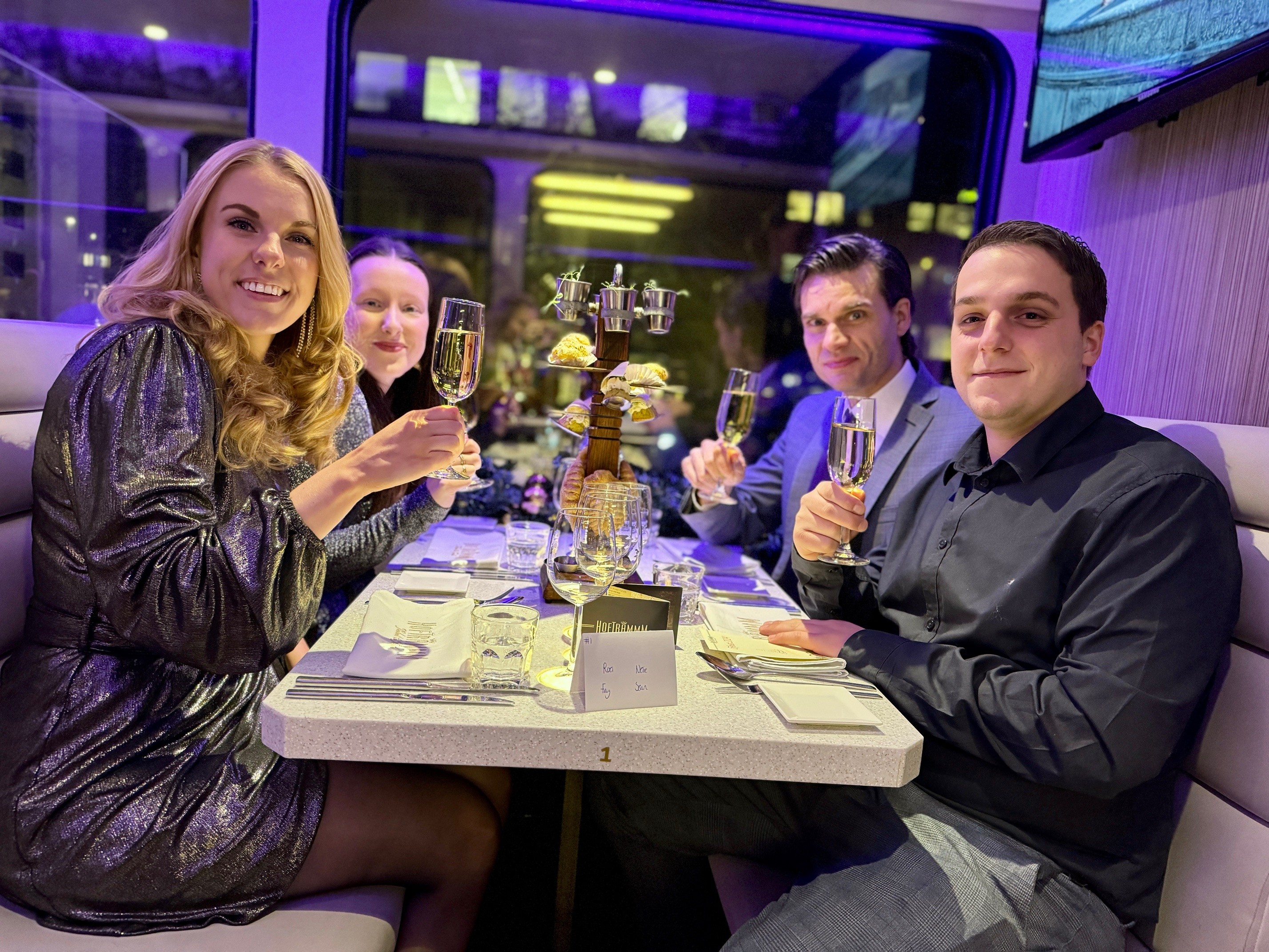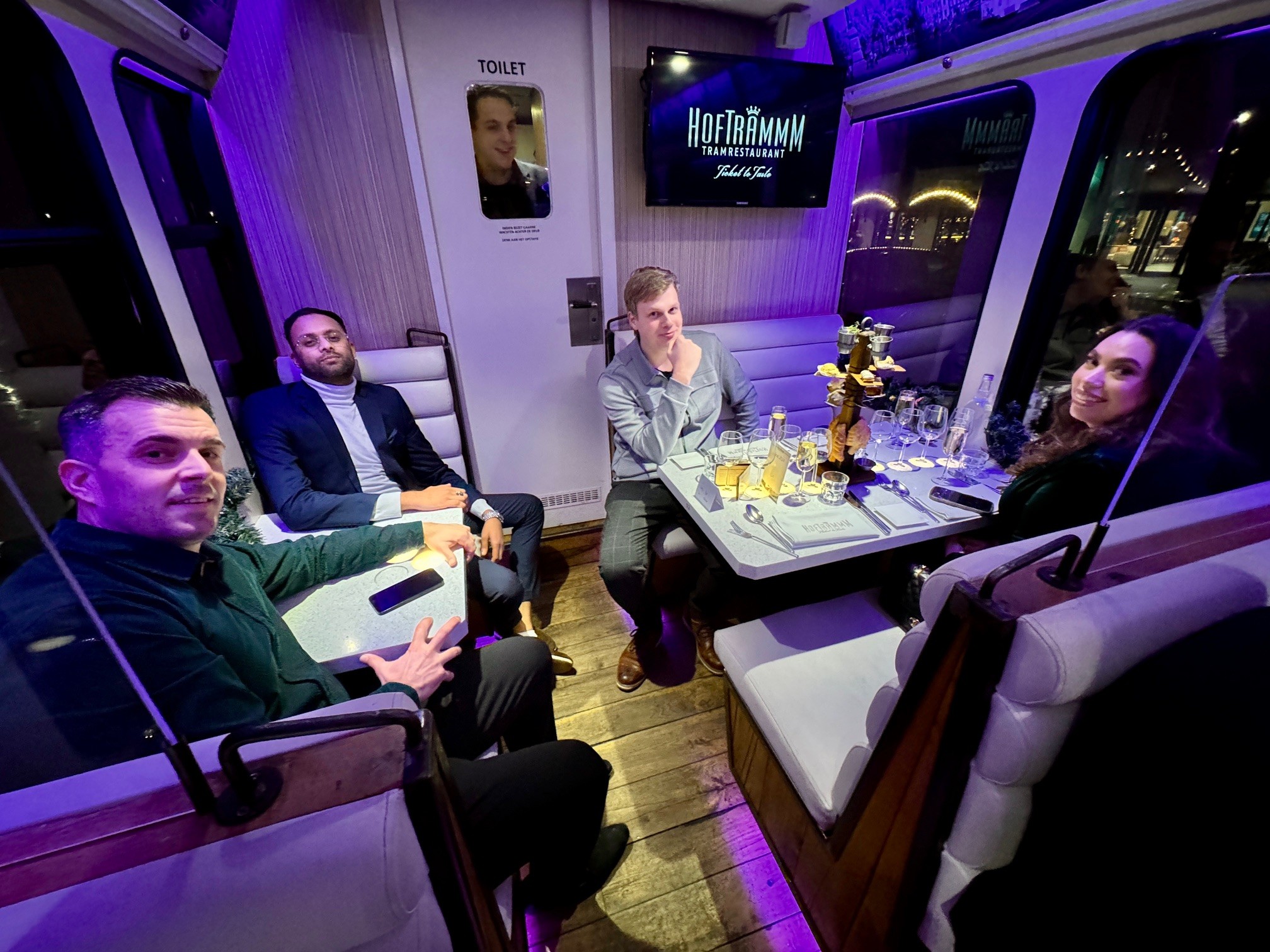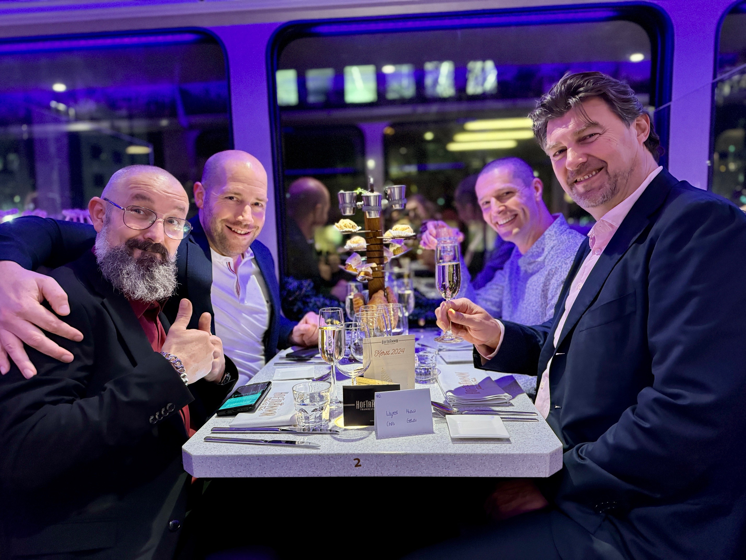 Op een koude maar sfeervolle decemberavond vierde MainPlus haar jaarlijkse kerstfeest op een wel heel bijzondere locatie: de Hoftrammm. Deze culinaire tram, die door de straten van Den Haag rijdt, bood een unieke setting voor een avond vol gezelligheid, lekker eten en de warme kerstsfeer die je alleen met collega’s kunt beleven.