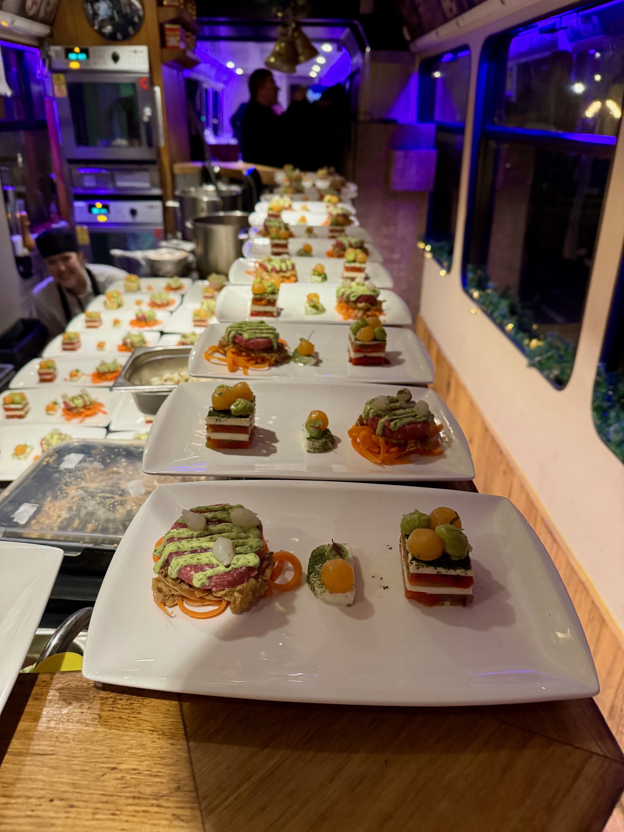 Het diner was een van de hoogtepunten van de avond. Terwijl de tram zachtjes door de stad reed, werden de gasten verwend met een viergangenmenu, samengesteld door chefkok Pierre Wind. Elk gerecht was een kunstwerk op zich, met lokale ingrediënten en een feestelijke twist. Van een heerlijke Rouleau van Gamba als voorgerecht tot een smaakvolle eendenborst als hoofdgerecht, de culinaire ervaring liet niets te wensen over. Uiteraard werd alles begeleid door bijpassende wijnen en heerlijke kerstdrankjes.